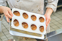 紅茶とチョコレートの香りを楽しむプティ・ガトー。少しでも手間を減らすべくセンターを使わずに組んでおり、3種のムースの層で構成されている。ビスキュイ・カカオにバターと半々で使用するサラダ油は「コストダウンと、冷蔵庫で冷やしても生地が締まらず硬くならなくするため。ケーキ全体で食べた時に強く感じられる味ではないため、バターではなく100%サラダ油でも問題ありません」と解説。