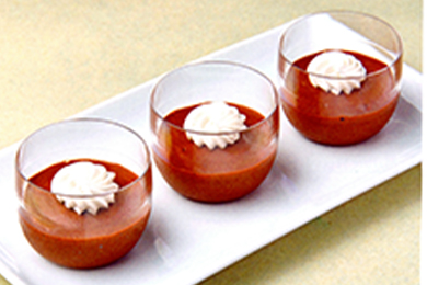 チョコレートを使わずに仕上げたヴィーガンのチョコレートムース。乳製品や卵を使わず、ココアやココナッツミルクなどでコクを出している。アガーを使用することで、軽い口当たりと安定した食感に仕上げている。